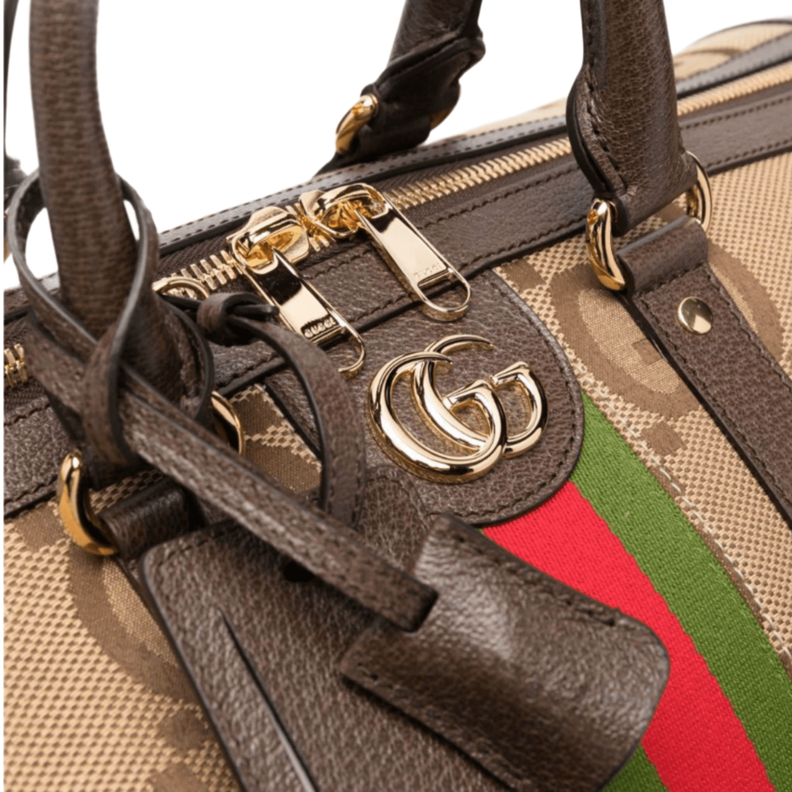 Borsone grande in pelle Jumbo GG di Gucci con hardware color argento, tela Jumbo GG, etichetta per bagaglio, chiusura superiore con zip, due manici superiori, tracolla staccabile, scomparto principale, tasca interna a bustina, beige e multicolore. Web rosso e verde.